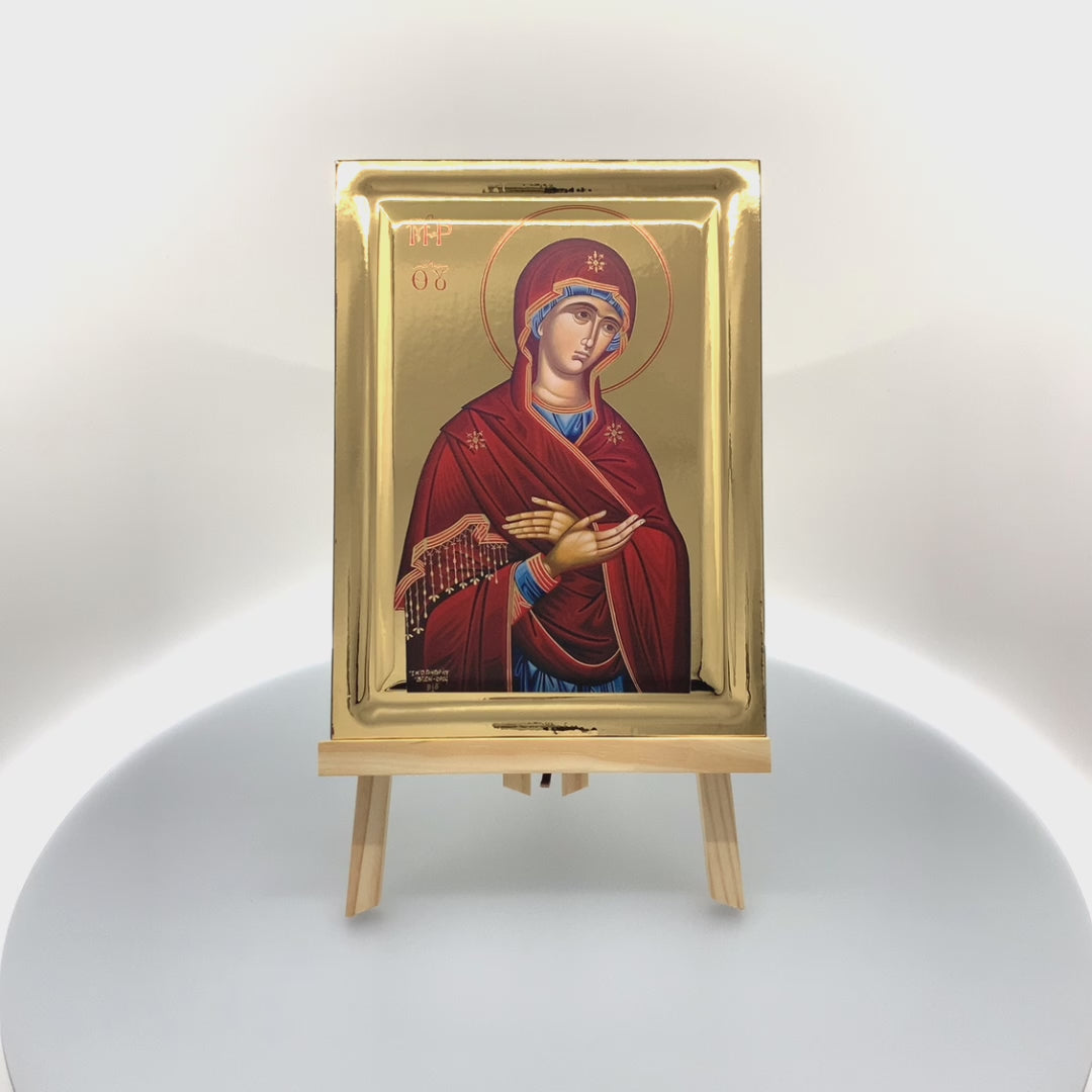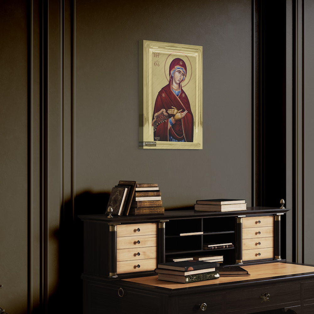 At the back of the icon, a mounting point is installed, accompanied by our Certificate of Authenticity and Quality. At the small sized icons a stand is also available. All of our artworks bear the studio’s distinctive title and logo.