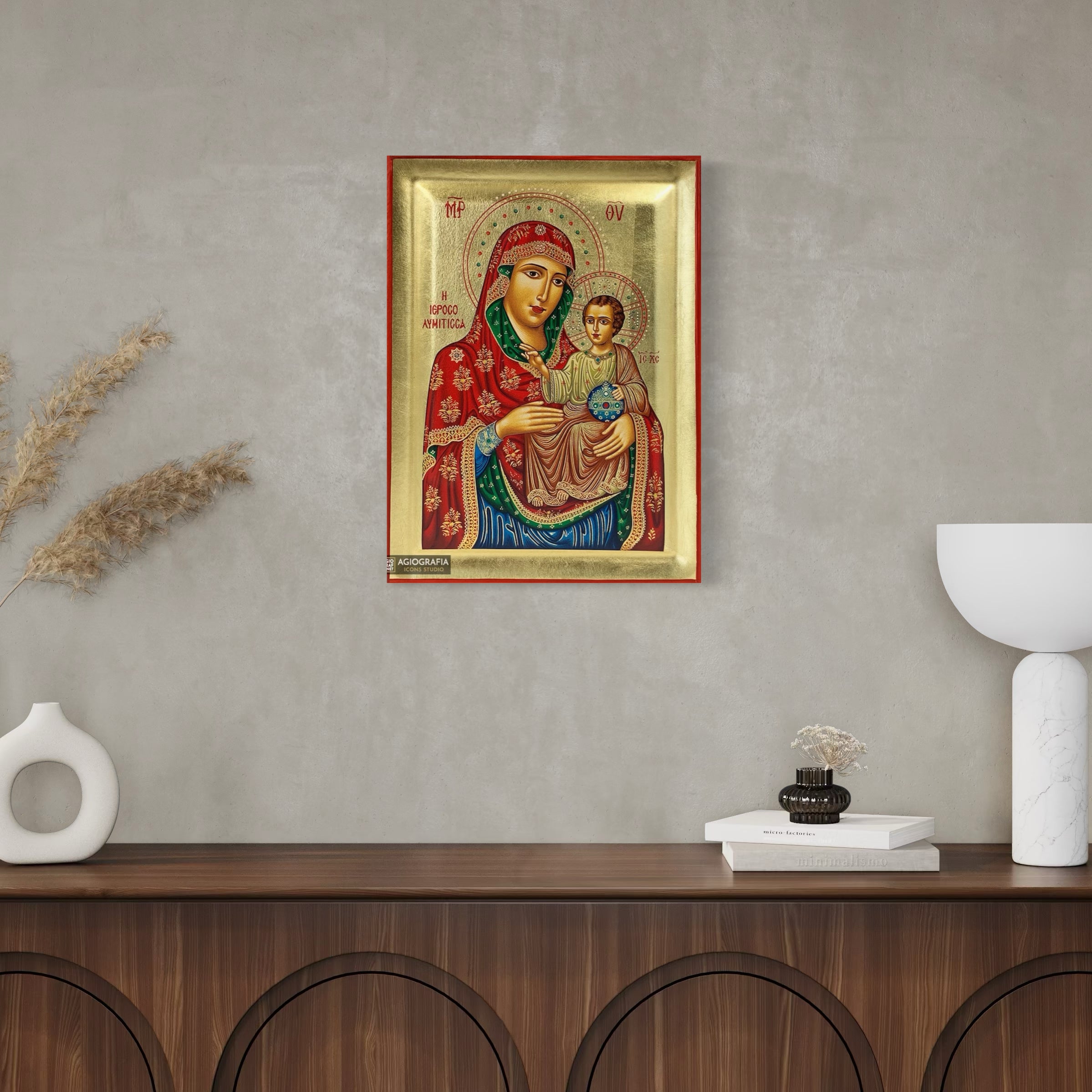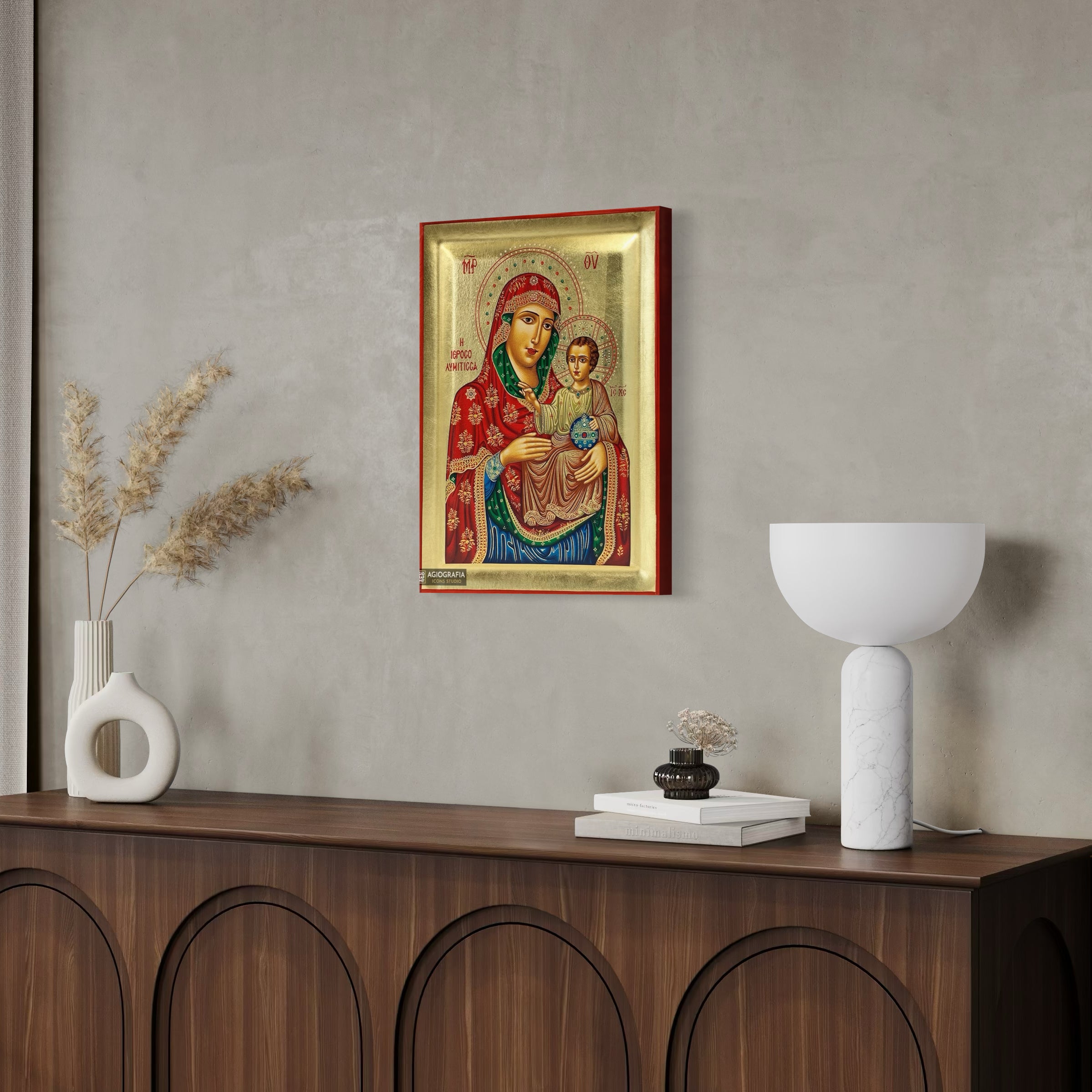 This is an authentic icon crafted according to Byzantine technique and style. All parts are made by hand and only the theme is reproduced using Advanced Silk Screen Technique.