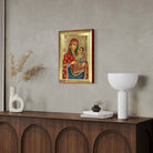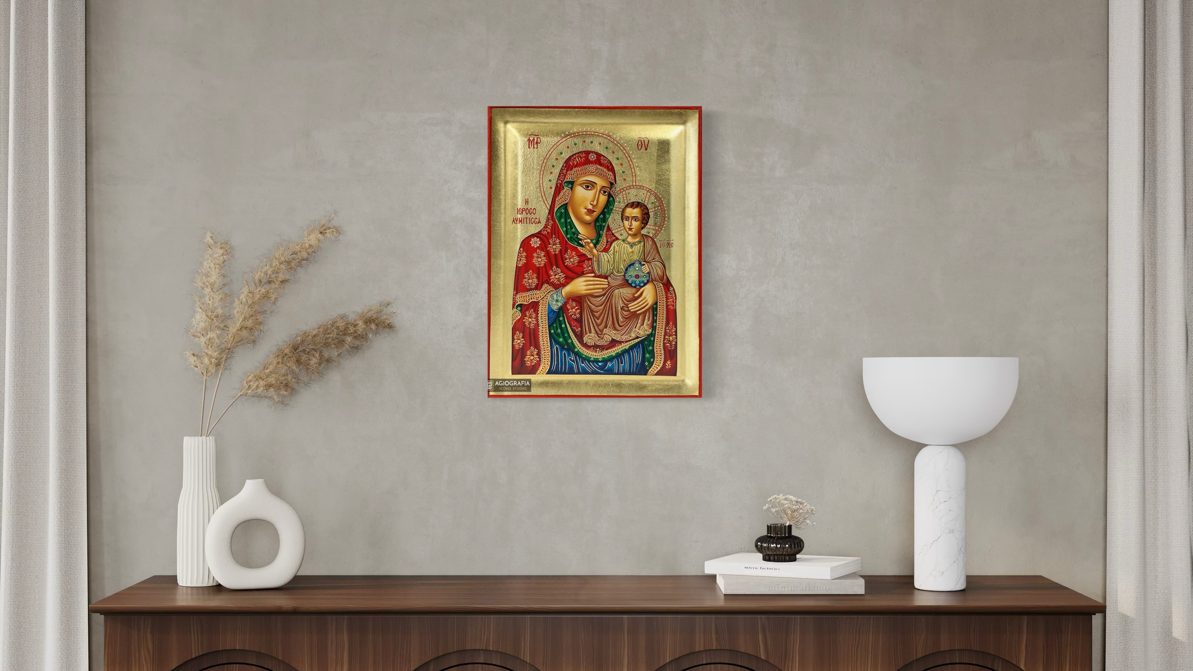 At the back of the icon, a mounting point is installed, accompanied by our Certificate of Authenticity and Quality. At the small sized icons a stand is also available. All of our artworks bear the studio’s distinctive title and logo.