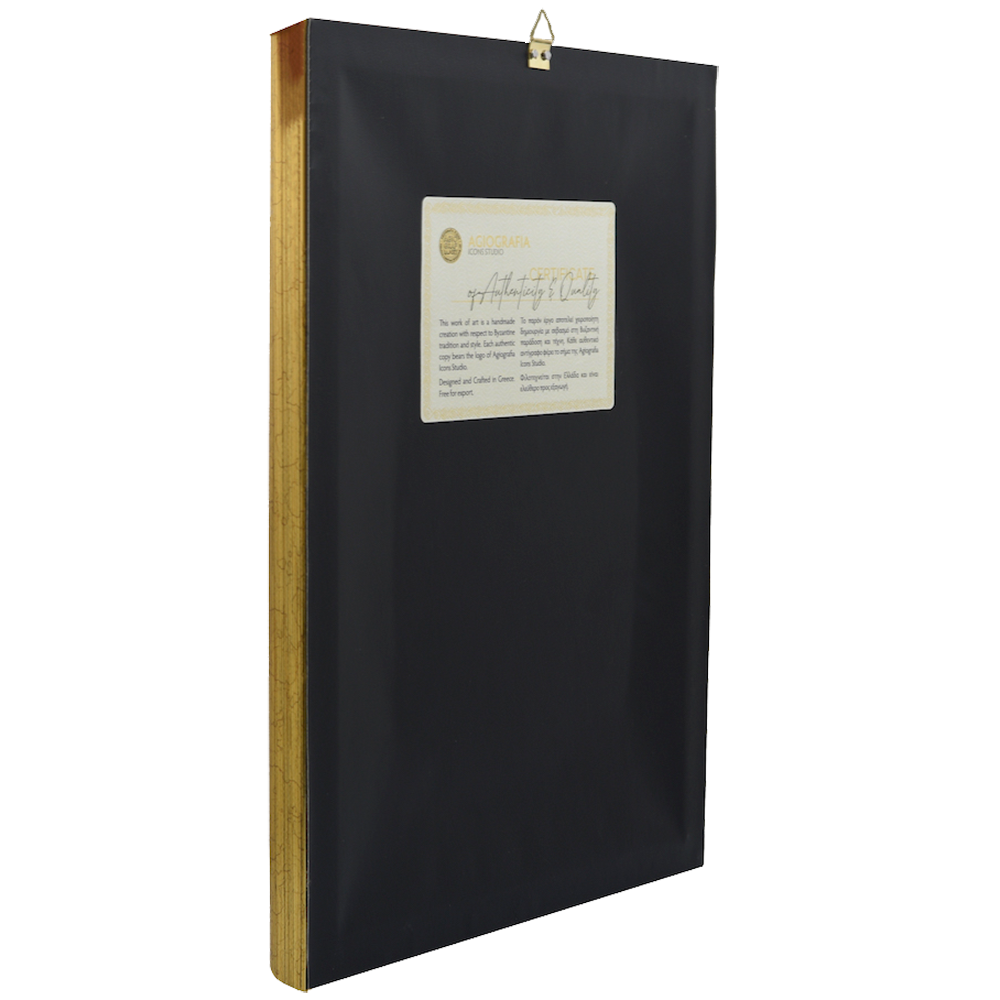 A mounting point is placed at the back of the icon, along with the Certificate of Authenticity and Quality. Each of our icons bears the studio's unique title and logo.