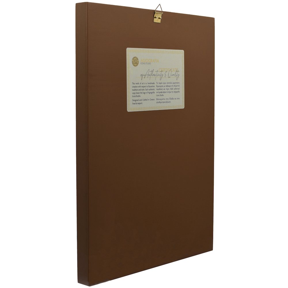 A mounting point is placed at the back of the icon, along with the Certificate of Authenticity and Quality. Each of our icons bears the studio's unique title and logo.