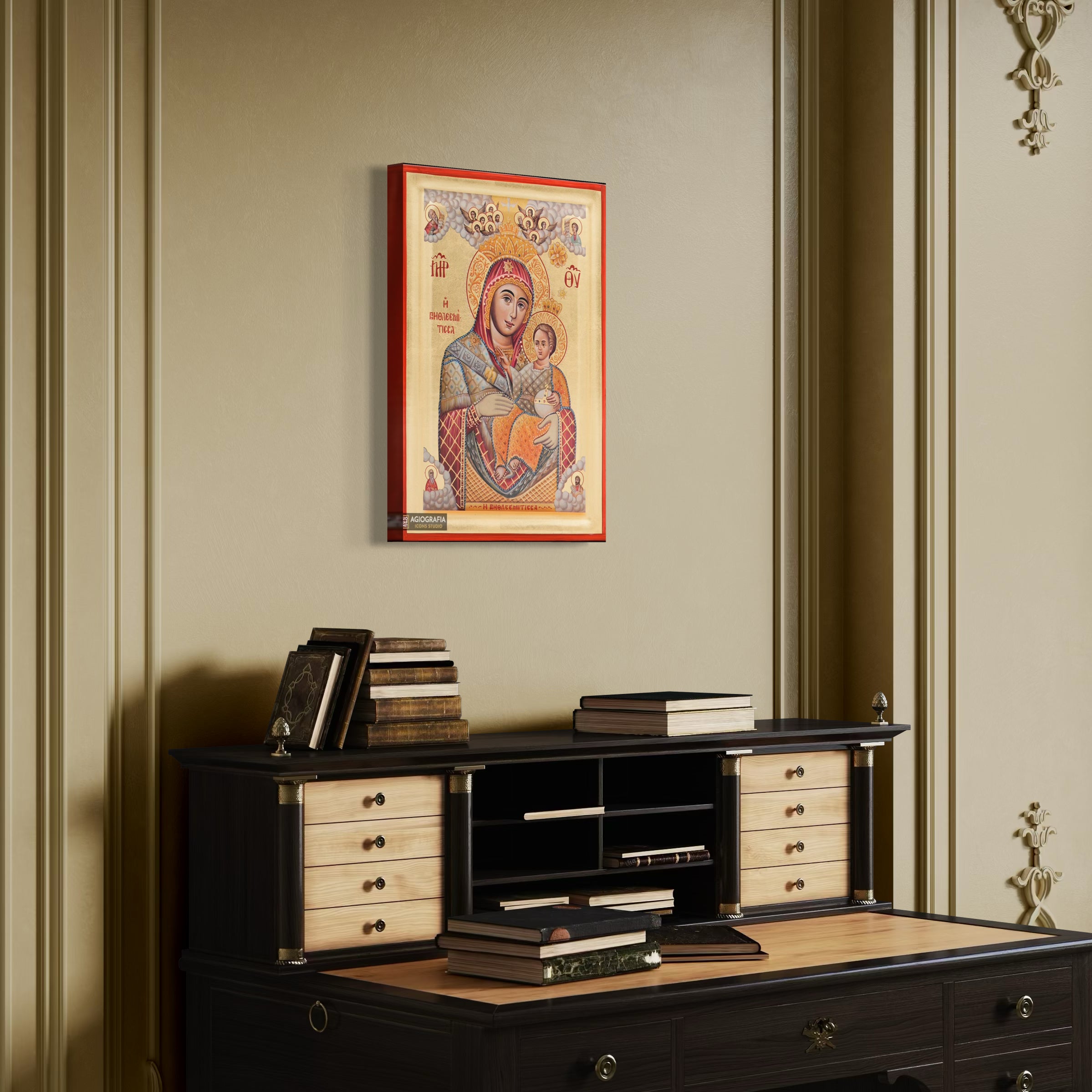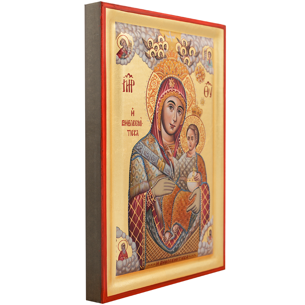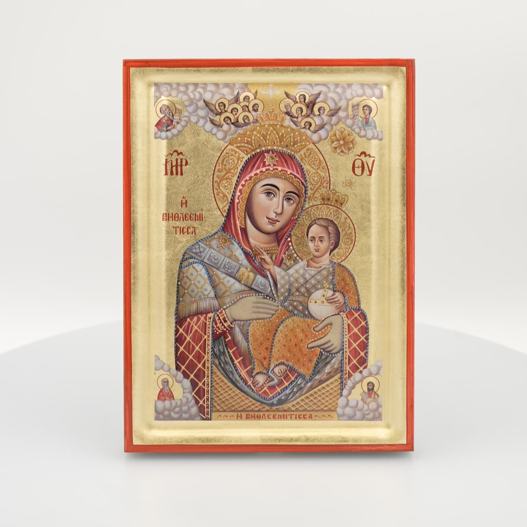 Dieses Ikon ist aus Holz und der Hintergrund ist handgefertigt aus Blattgold. Das Motiv wird mit High-End-Geräten im Siebdruckverfahren direkt auf die Leinwand reproduziert. Es wird ordnungsgemäß und sicher verpackt geliefert. Wenn es sich um ein besonderes Geschenk handelt, können Sie optional auf eine Luxus-Ikonhülle upgraden, indem Sie auf der Warenkorbseite „Premium-Geschenkverpackung“ auswählen. Jedes Ikon wird nach Ihrer Bestellung angefertigt und Sie erhalten die Kurierverfolgungsnummer, sobald es versandbereit ist.