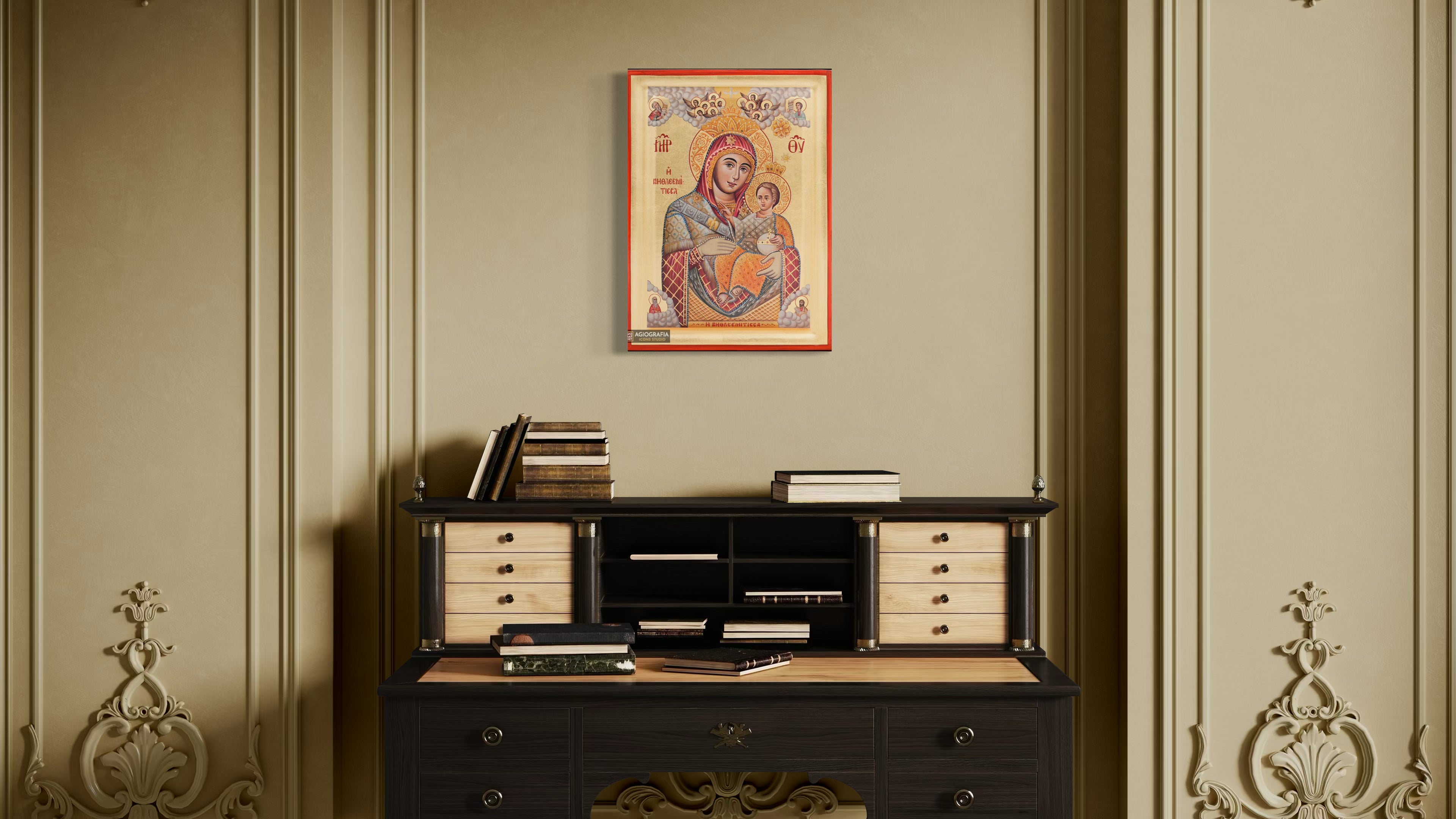 A mounting point is placed at the back of the icon, along with the Certificate of Authenticity and Quality. Each of our icons bears the studio's unique title and logo.