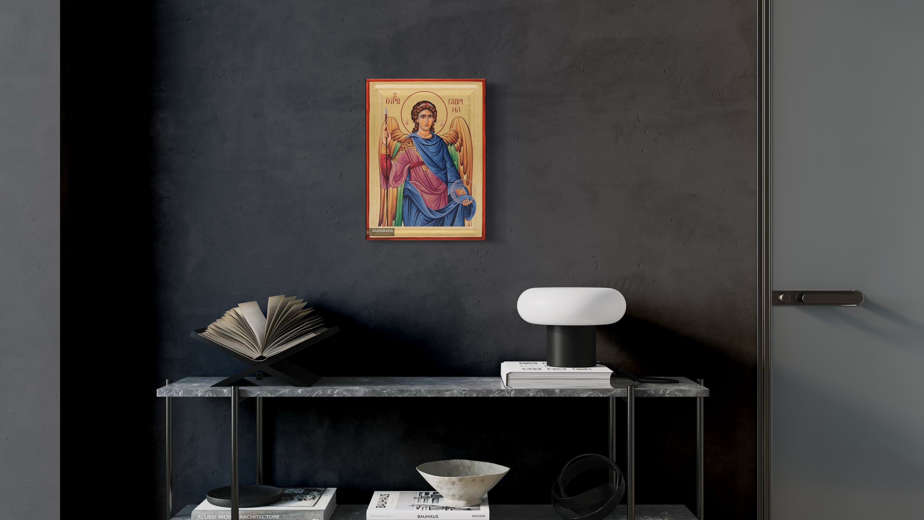 At the back of the icon, a mounting point is installed, accompanied by our Certificate of Authenticity and Quality. At the small sized icons a stand is also available. All of our artworks bear the studio’s distinctive title and logo.