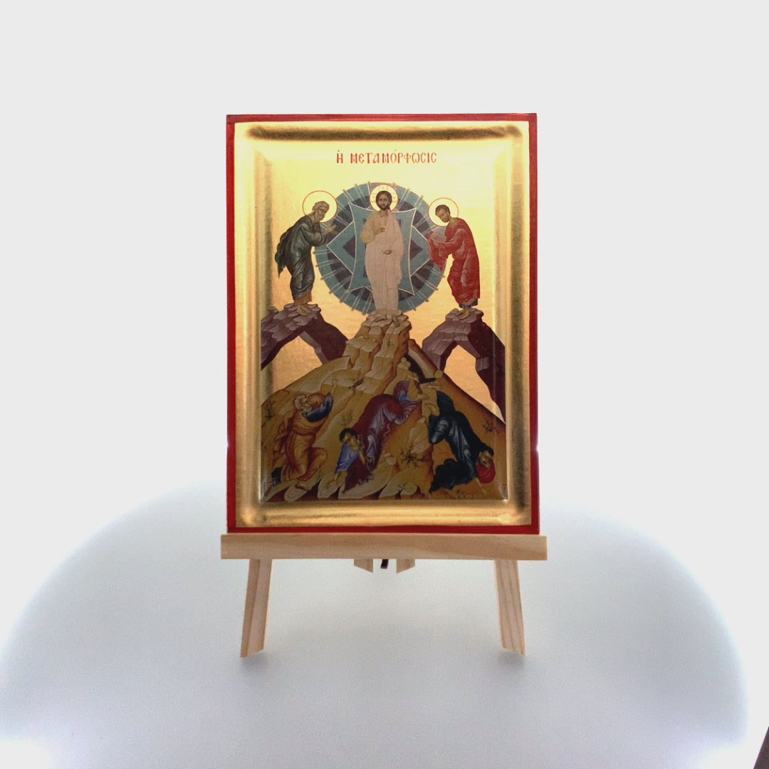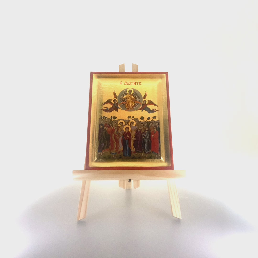 At the back of the icon, a mounting point is installed, accompanied by our Certificate of Authenticity and Quality. At the small sized icons a stand is also available. All of our artworks bear the studio’s distinctive title and logo.