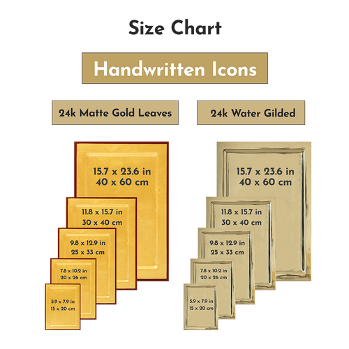 Este ícono es una obra de arte bizantino 100 % manuscrita, totalmente elaborada y pintada a mano. Está hecho de madera y puedes elegir entre hojas de oro mate o un fondo dorado al agua de 24 quilates. Este ícono está totalmente hecho a mano y, aunque puede tener ligeras diferencias con las fotos que se muestran, se entrega empaquetado de manera adecuada y segura en un estuche de lujo para íconos. Cada ícono se elabora después de realizar el pedido y recibirás el número de seguimiento del mensajero una vez que esté listo para enviarse.