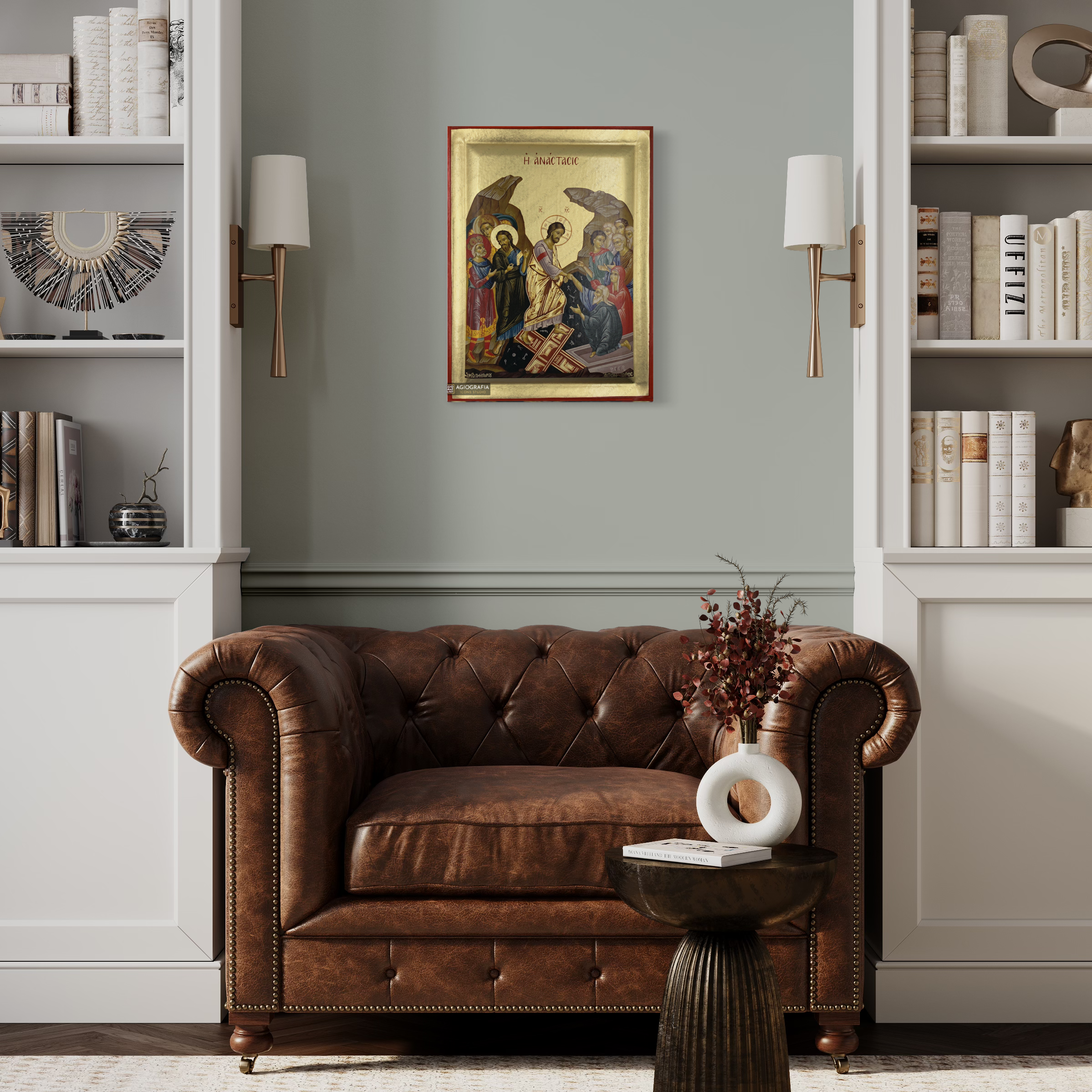 A mounting point is placed at the back of the icon, along with the Certificate of Authenticity and Quality. Each of our icons bears the studio's unique title and logo.