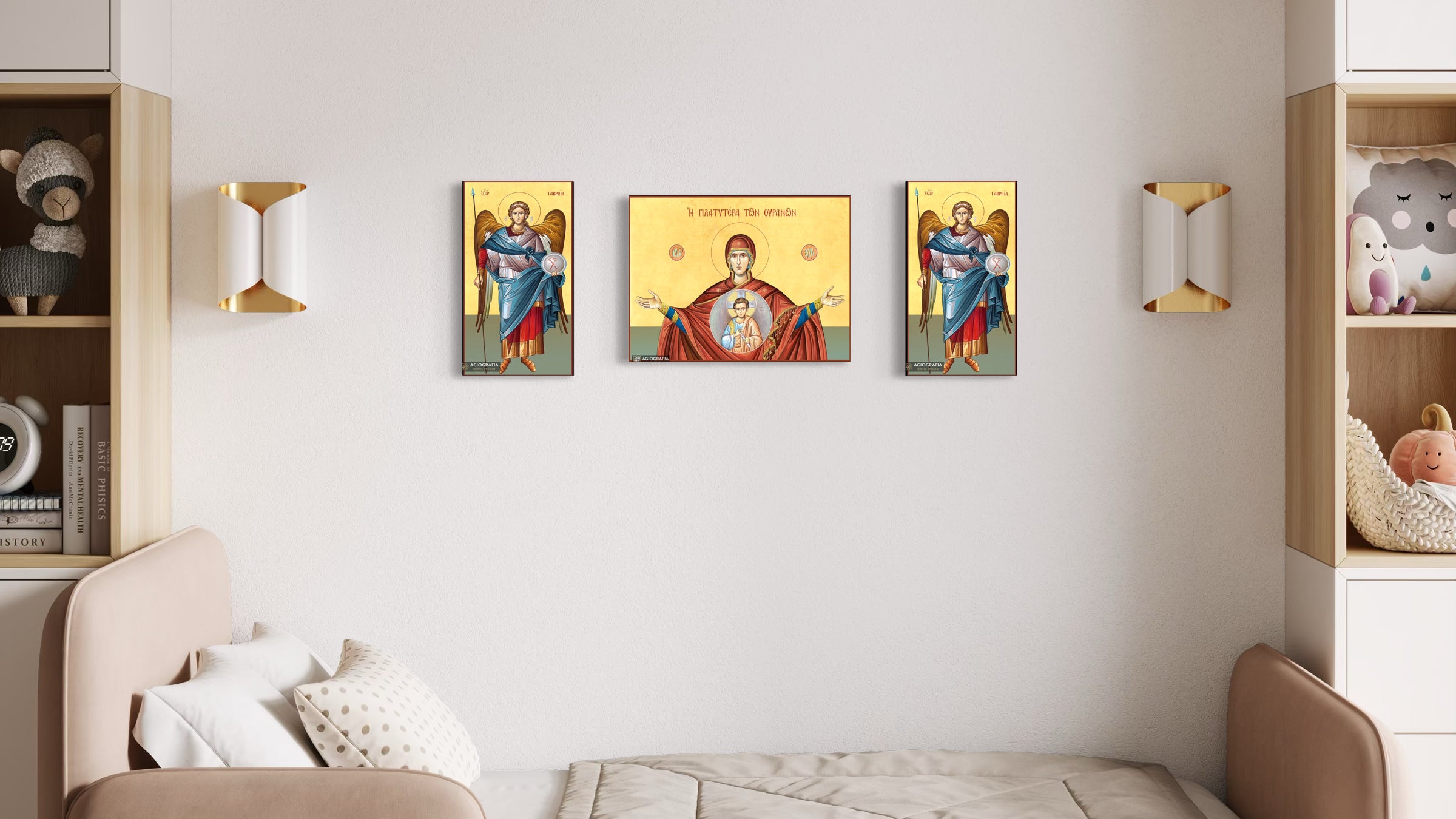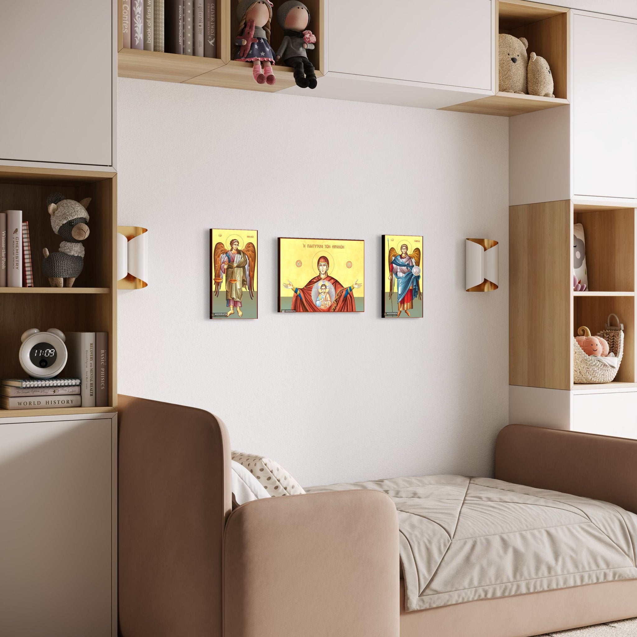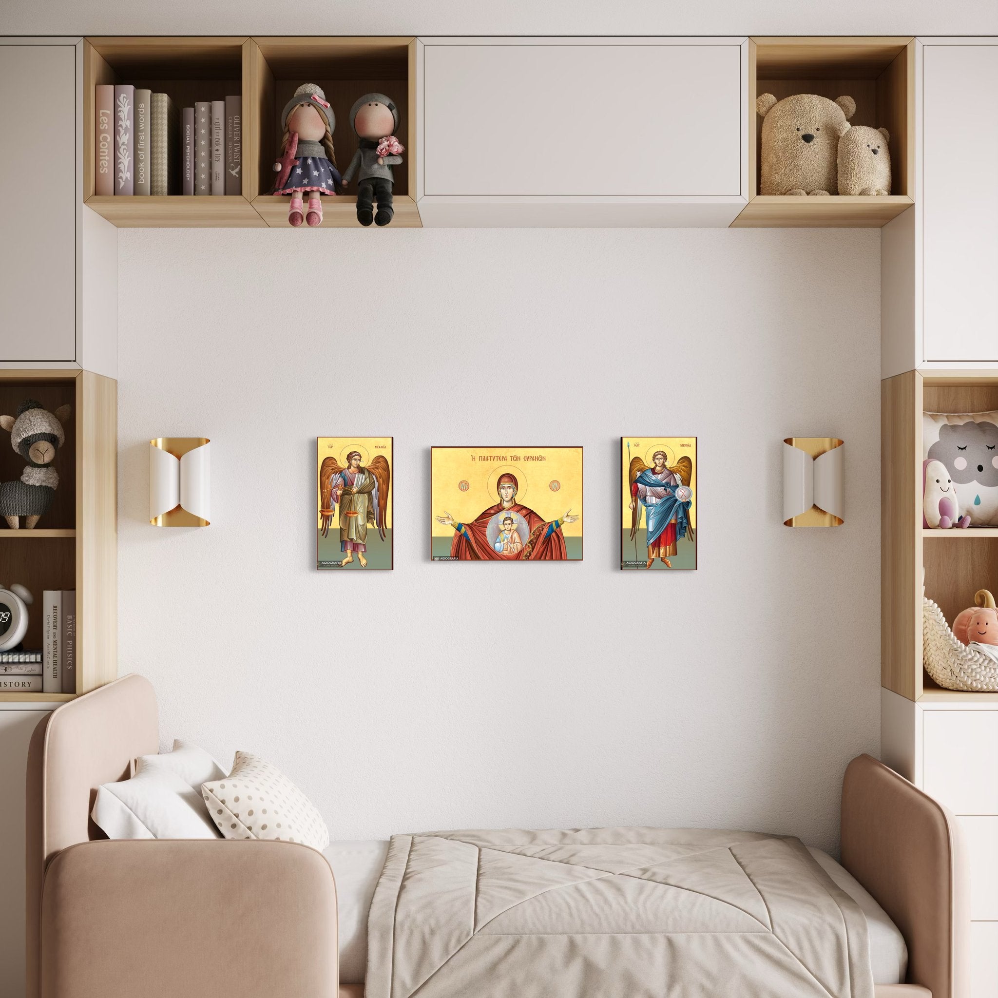 Build a little corner of heaven in your child's room with these delightful Christian icons! Meet Archangel Michael, the brave protector with his shield, Archangel Gabriel, the friendly messenger with big news, and the gentle Virgin Mary watching over it all. Perfect for a prayer corner or bedside spot, these beautiful Byzantine-style pieces make faith feel close and comforting. Watch your child's imagination soar as sacred stories come to life on their walls—a joyful way to grow spiritually every single day.
