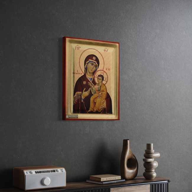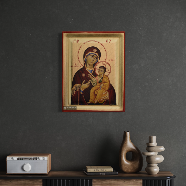 At the back of the icon, a mounting point is installed, accompanied by our Certificate of Authenticity and Quality. At the small sized icons a stand is also available. All of our artworks bear the studio’s distinctive title and logo.