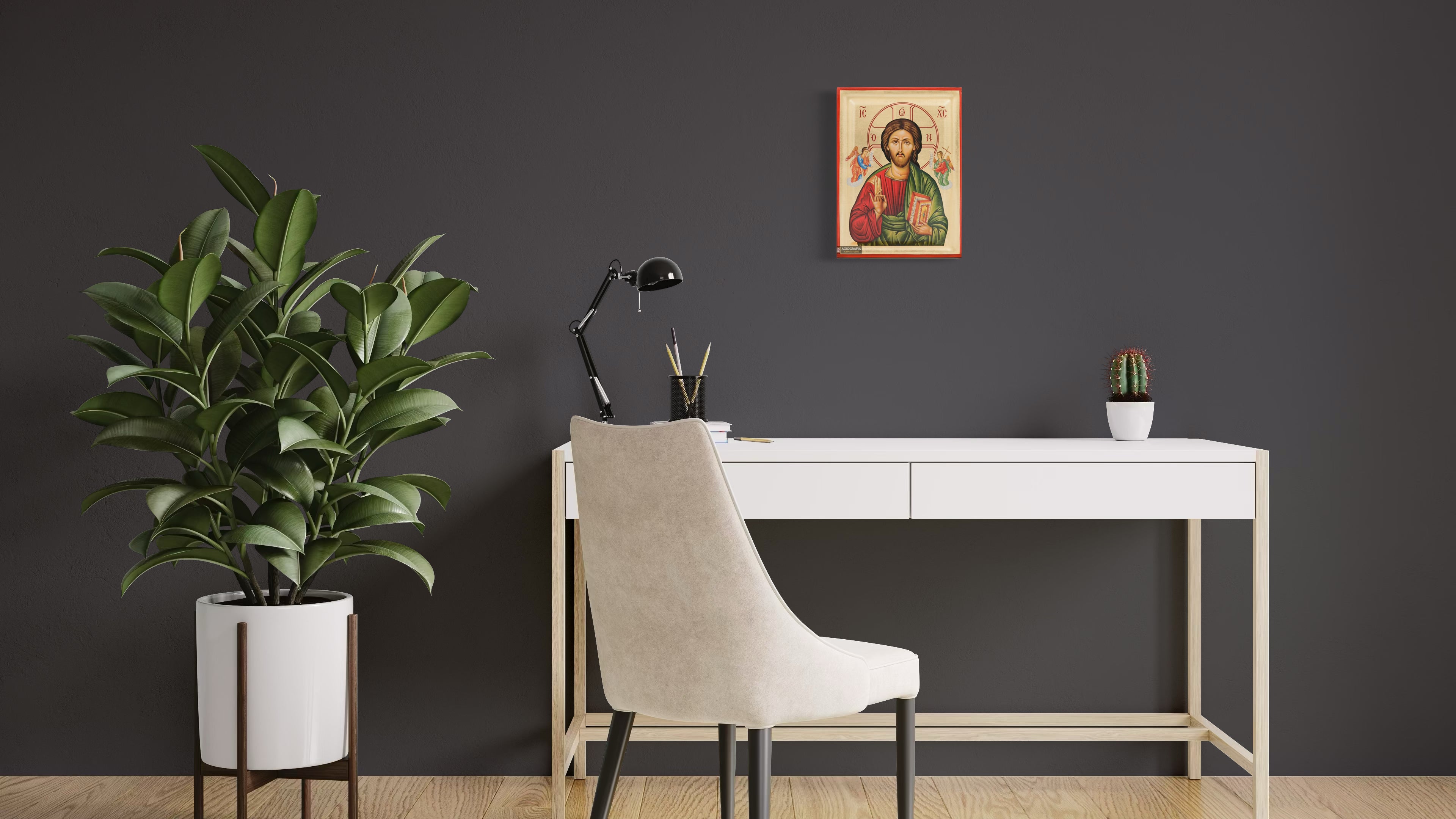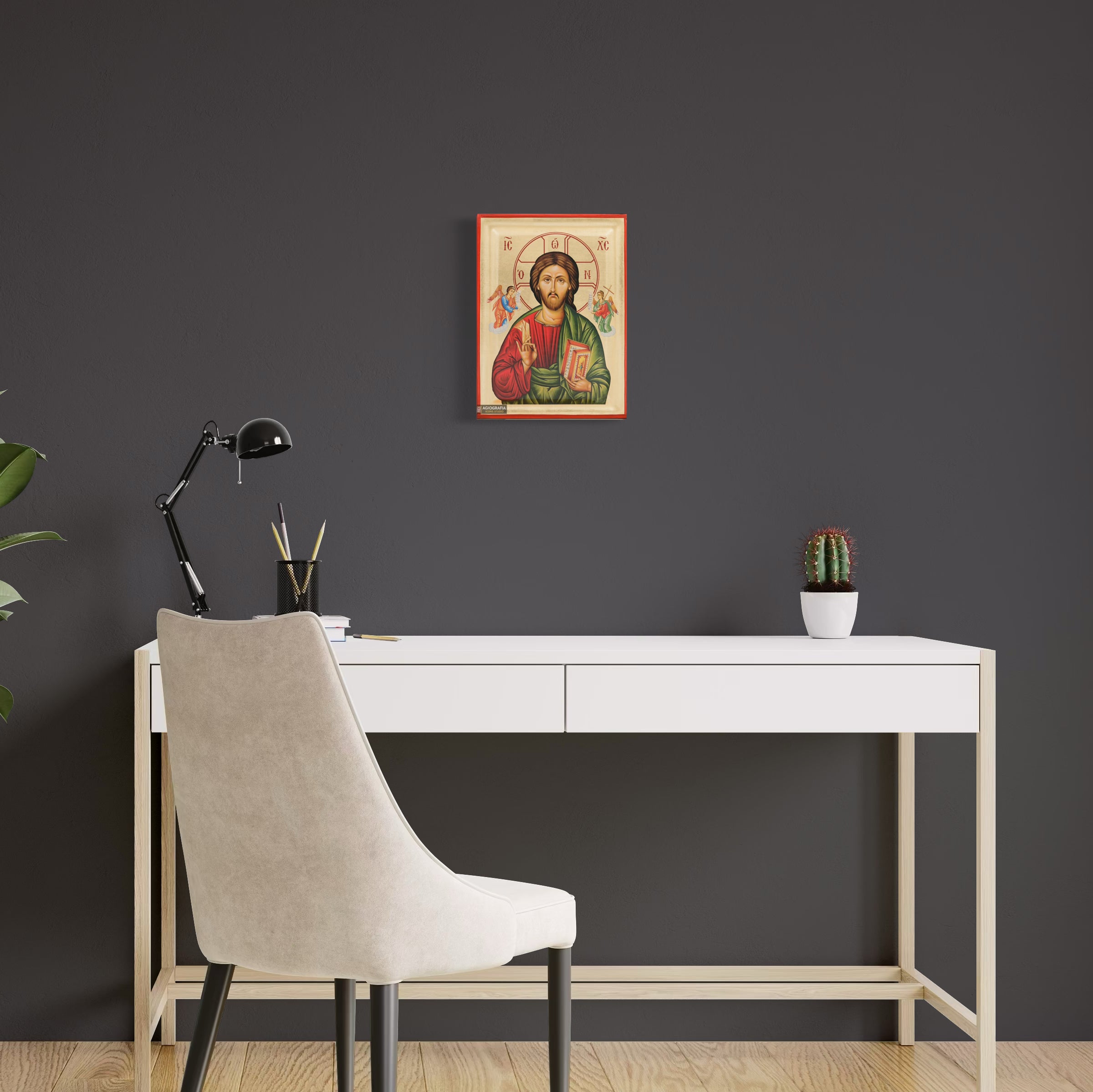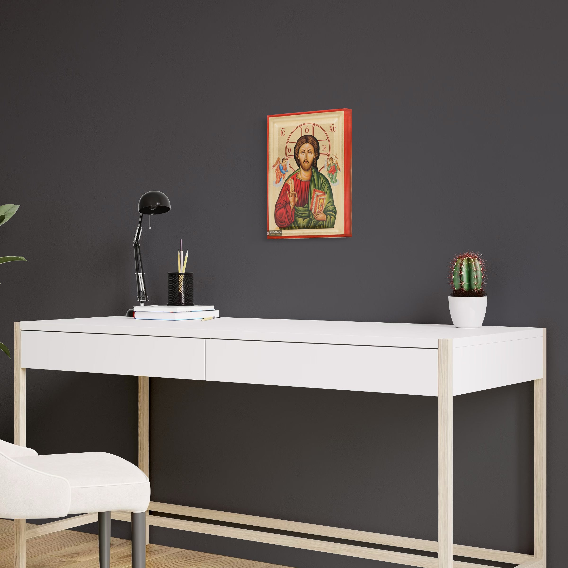 A mounting point is placed at the back of the icon, along with the Certificate of Authenticity and Quality. Each of our icons bears the studio's unique title and logo.