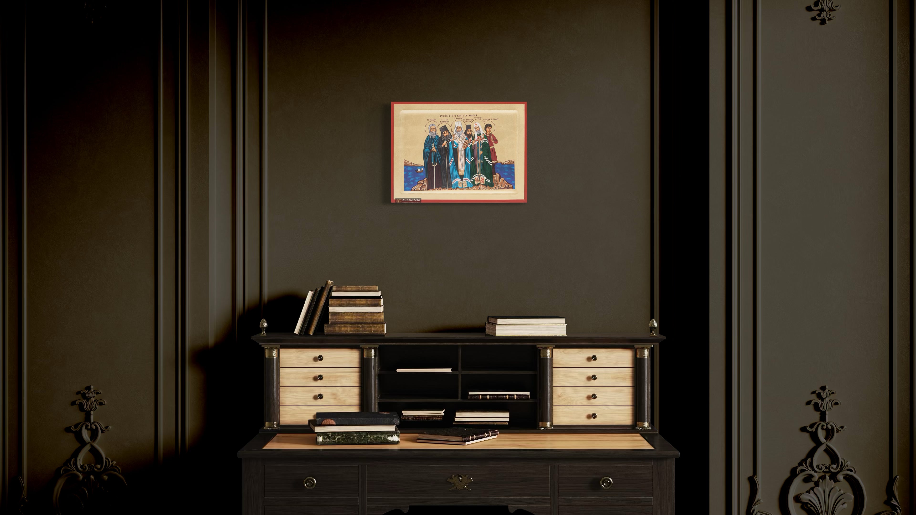 At the back of the icon, a mounting point is installed, accompanied by our Certificate of Authenticity and Quality. All of our artworks bear the studio’s distinctive title and logo.