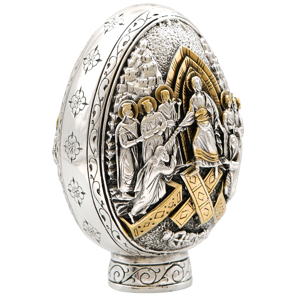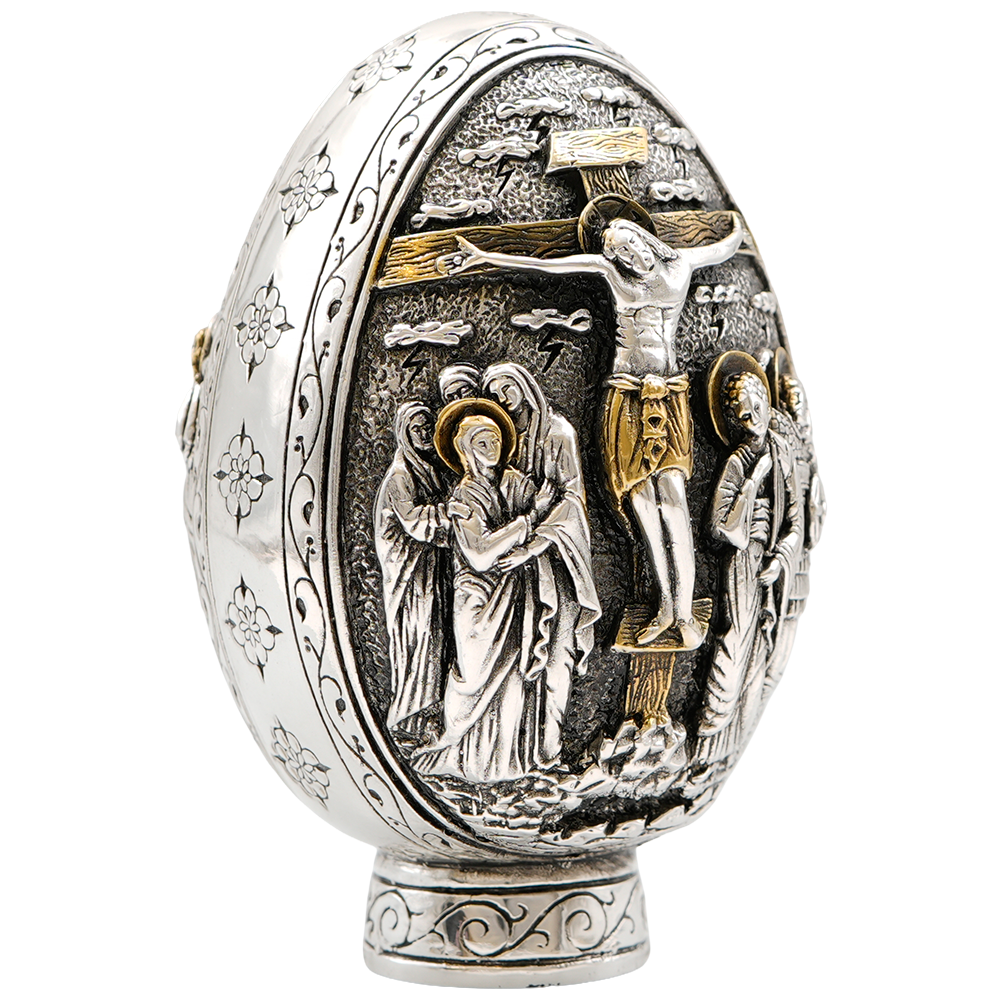 Elevate your Christian collection with this extraordinary sterling silver Jesus Christ's Crucifixion and Resurrection Egg. A true heirloom artifact which has at one side Jesus Christ's Crucifixion and on the other Jesus Christ's Resurrection.