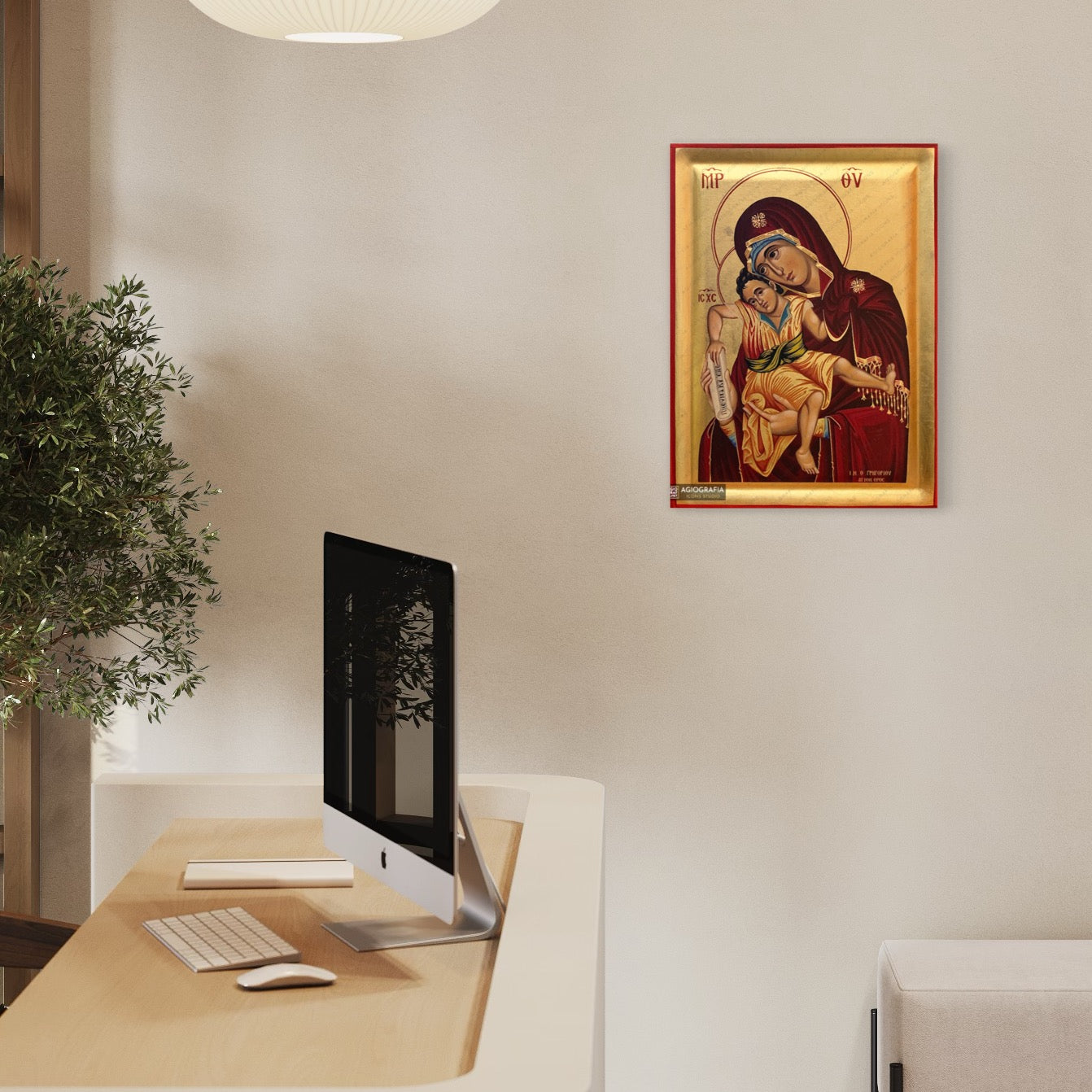 A mounting point is placed at the back of the icon, along with the Certificate of Authenticity and Quality. Each of our icons bears the studio's unique title and logo.