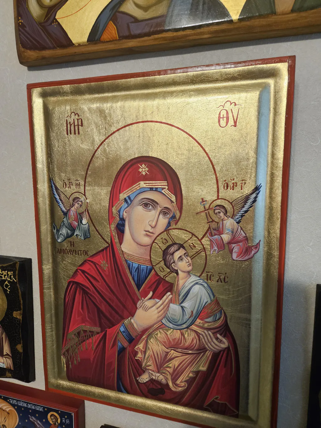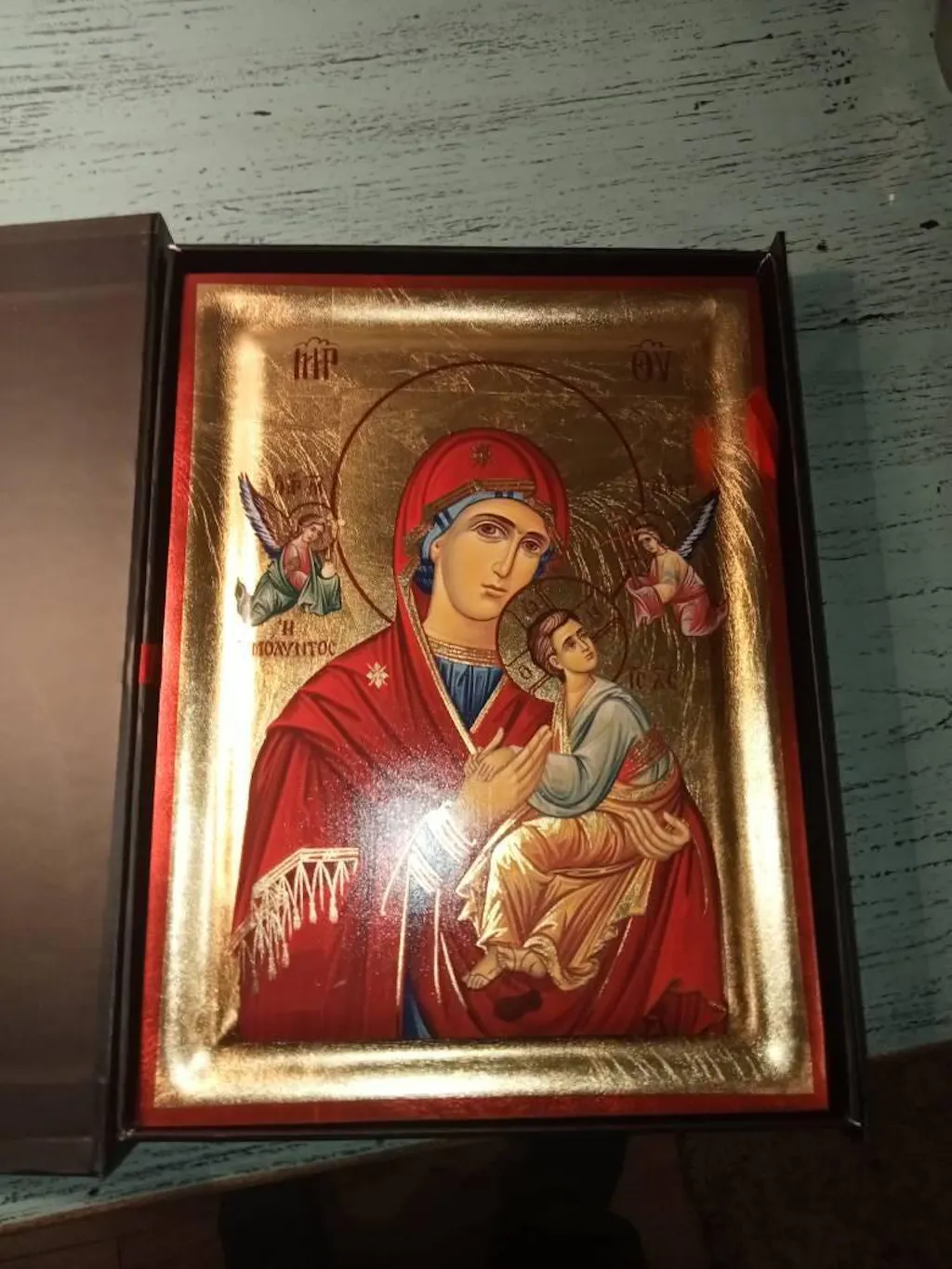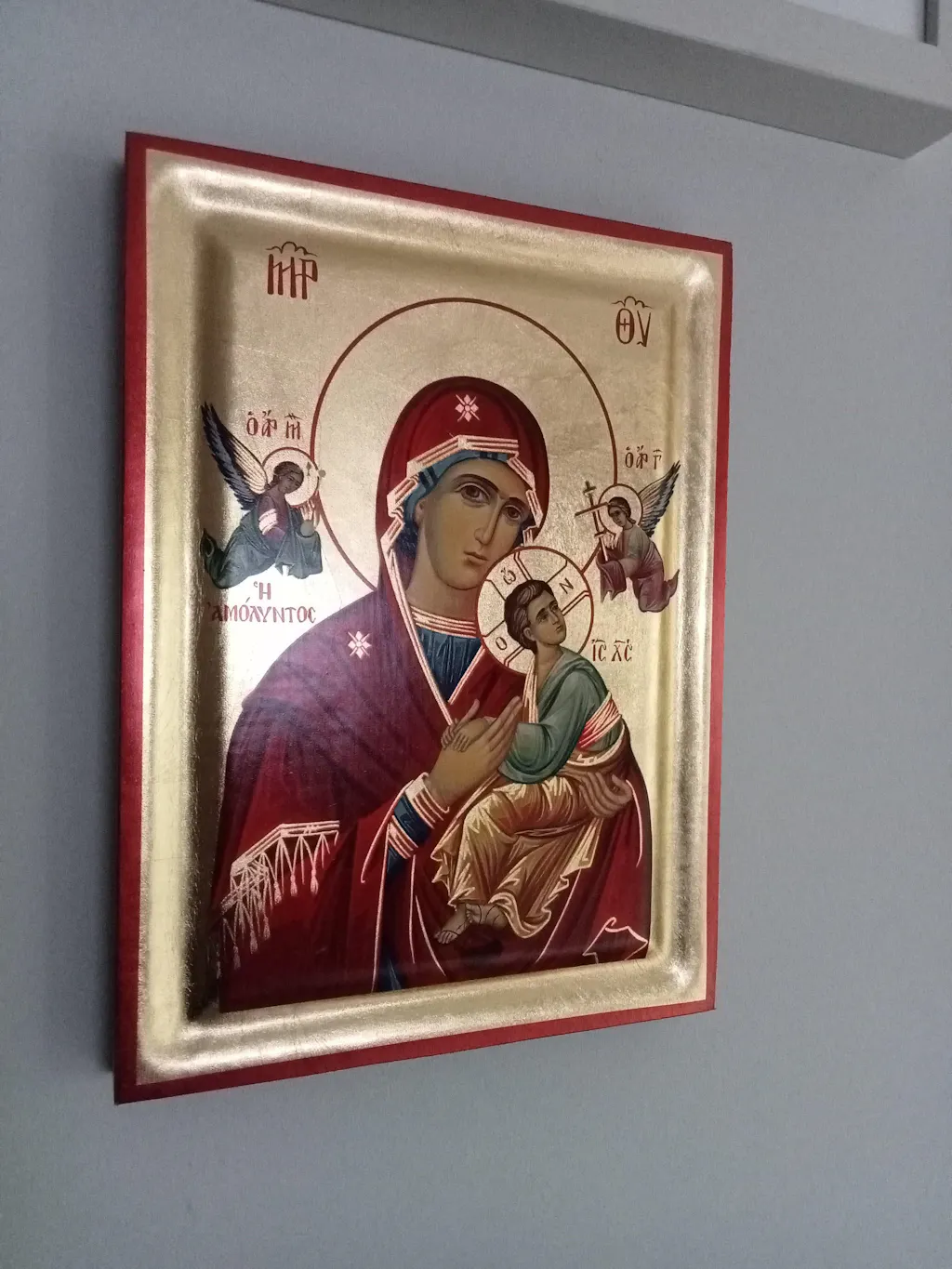At the back of the icon, a mounting point is installed, accompanied by our Certificate of Authenticity and Quality. At the small sized icons a stand is also available. All of our artworks bear the studio’s distinctive title and logo.