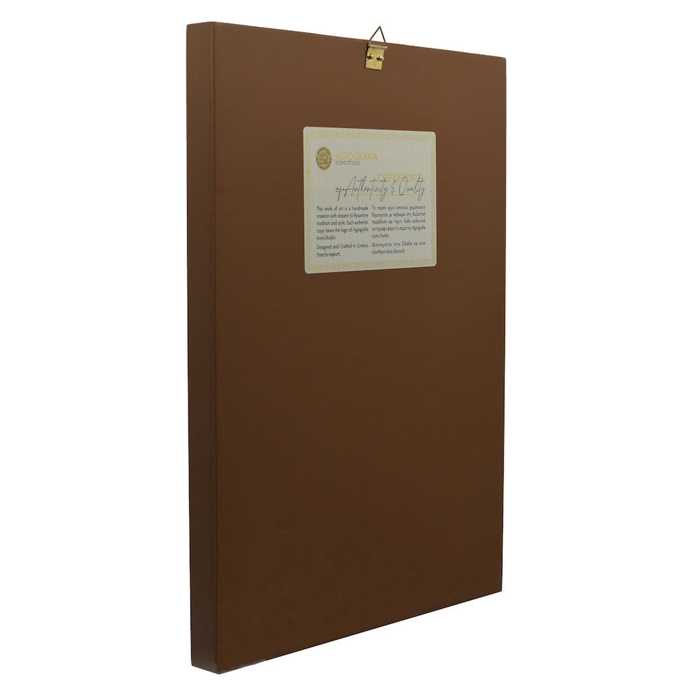 A mounting point is placed at the back of the icon, along with the Certificate of Authenticity and Quality. Each of our icons bears the studio's unique title and logo.