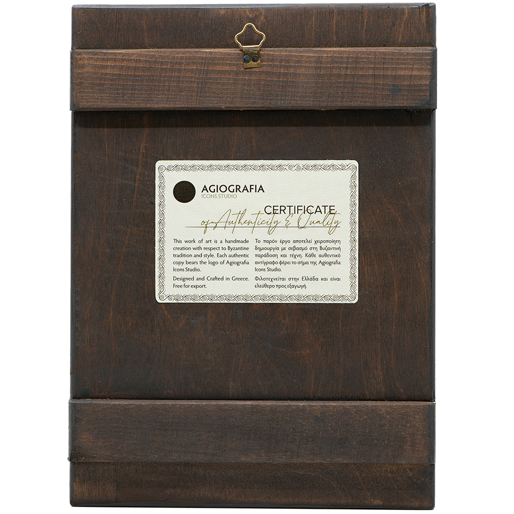A mounting point is placed at the back of the icon, along with the Certificate of Authenticity and Quality. Each of our icons bears the studio's unique title and logo.