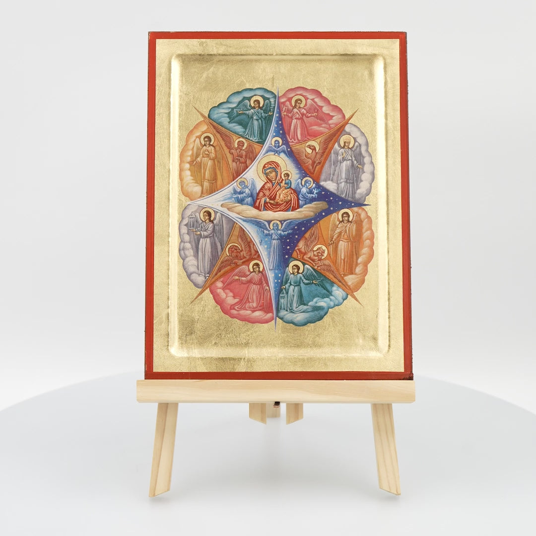 Эта икона сделана из дерева, а фон изготовлен вручную из золотых листьев. Тема воспроизводится прямо на холсте с использованием высококлассного оборудования в соответствии с техникой шелкографии. Он доставляется должным образом и надежно упакованным. Если это особый подарок, вы можете при желании улучшить его до роскошного футляра для икон, выбрав подарочную упаковку премиум-класса на странице корзины. Каждая икона изготавливается по вашему заказу, а процедура подготовки занимает от 4 до 9 рабочих дней.