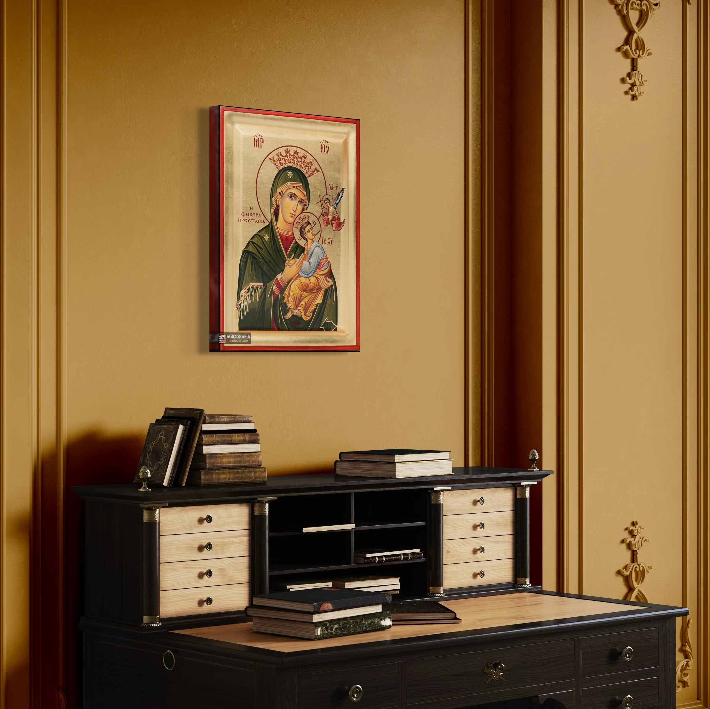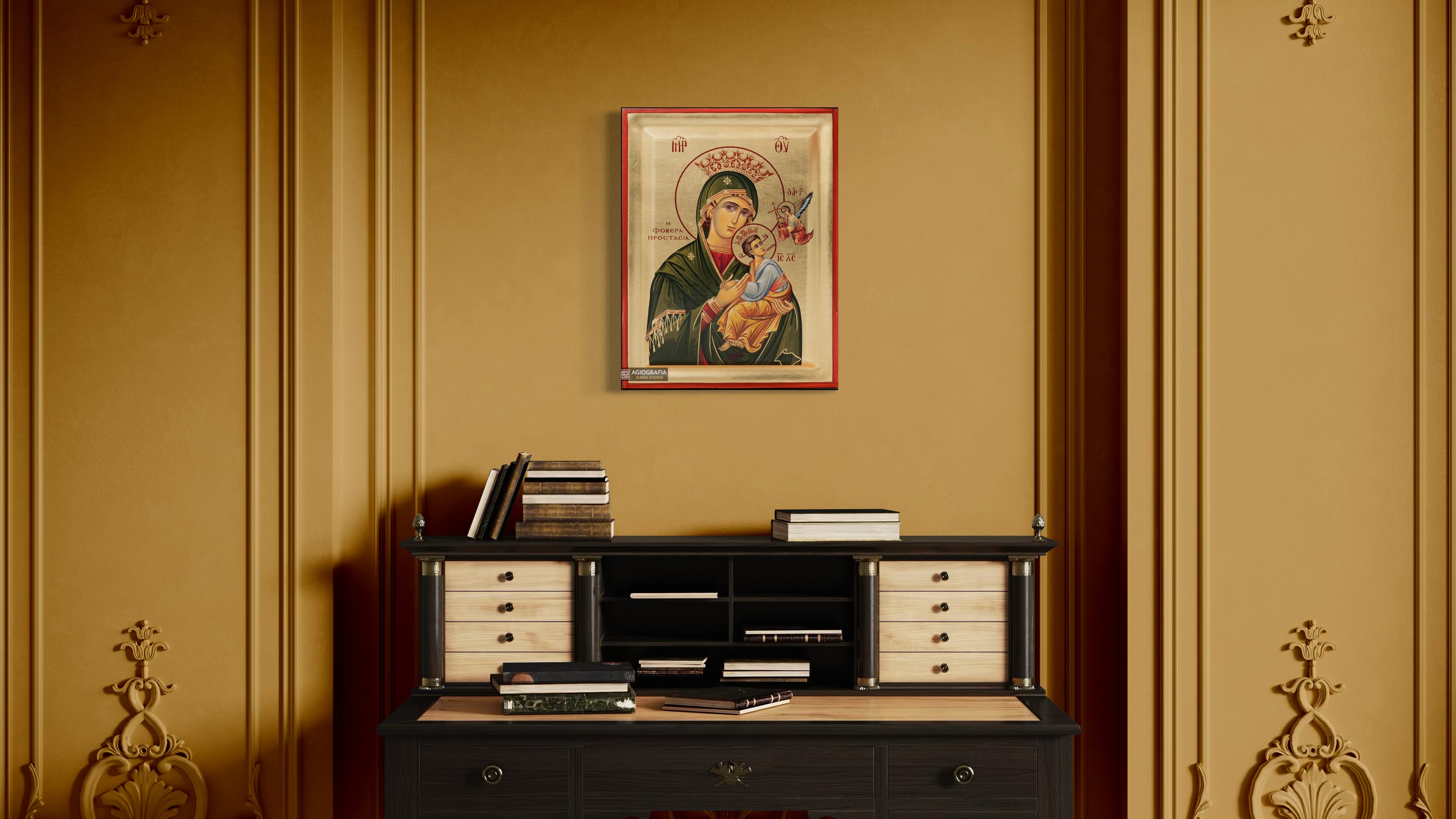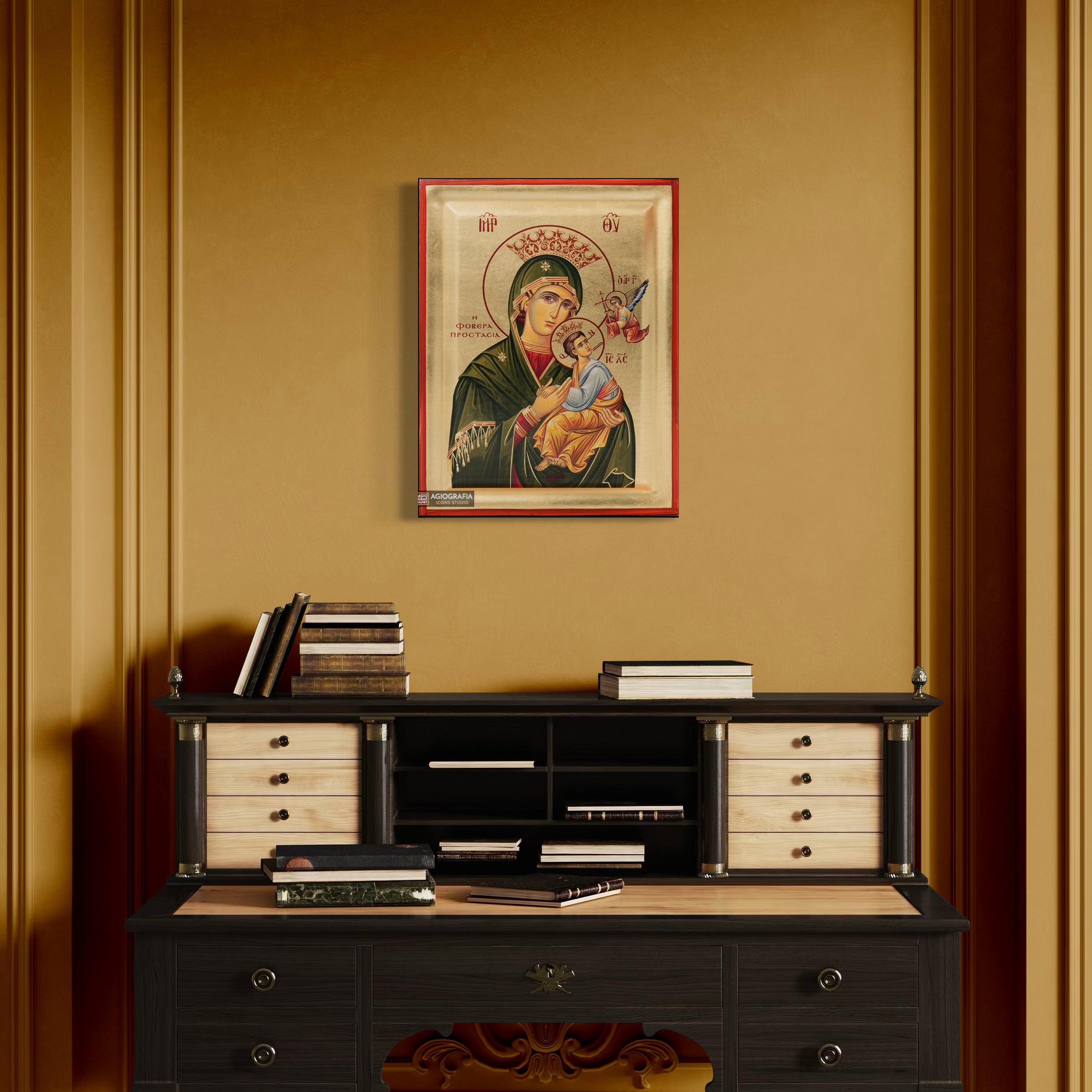 A mounting point is placed at the back of the icon, along with the Certificate of Authenticity and Quality. Each of our icons bears the studio's unique title and logo.