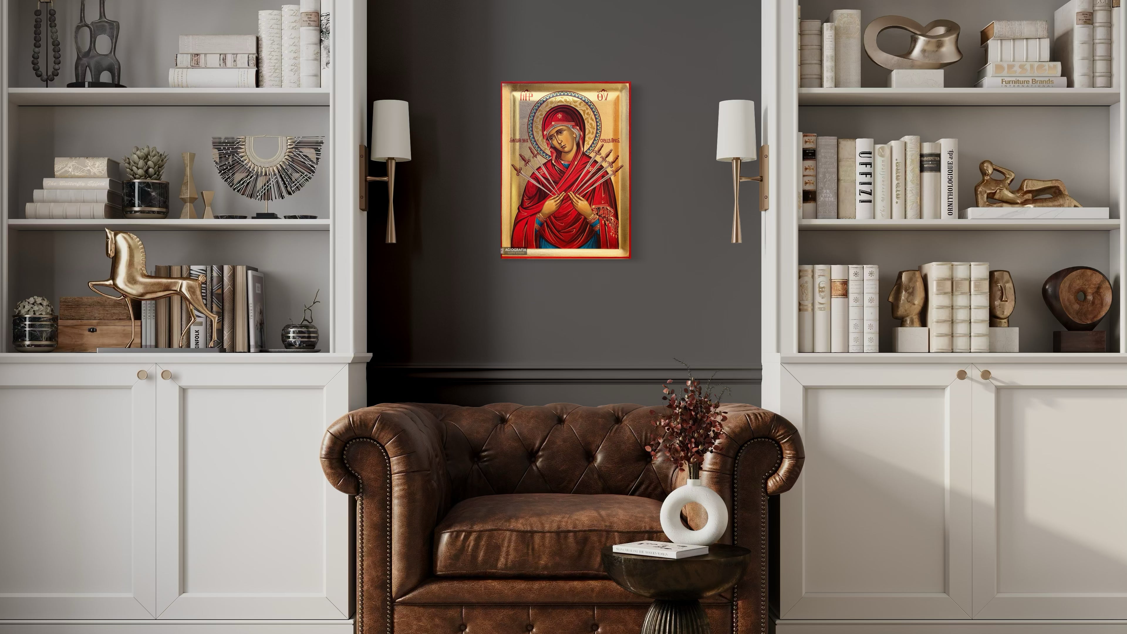 Эта иконка сделана из дерева, а фон сделан вручную из золотых листьев. Тема воспроизводится прямо на холсте с использованием высококачественного оборудования в соответствии с технологией шелкографии. Он доставляется должным образом и надежно упакованным. Если это особый подарок, вы можете при желании улучшить его до роскошного футляра для икон, выбрав подарочную упаковку премиум-класса на странице корзины. Каждая иконка изготавливается по вашему заказу, а процедура подготовки занимает от 4 до 9 рабочих дней.